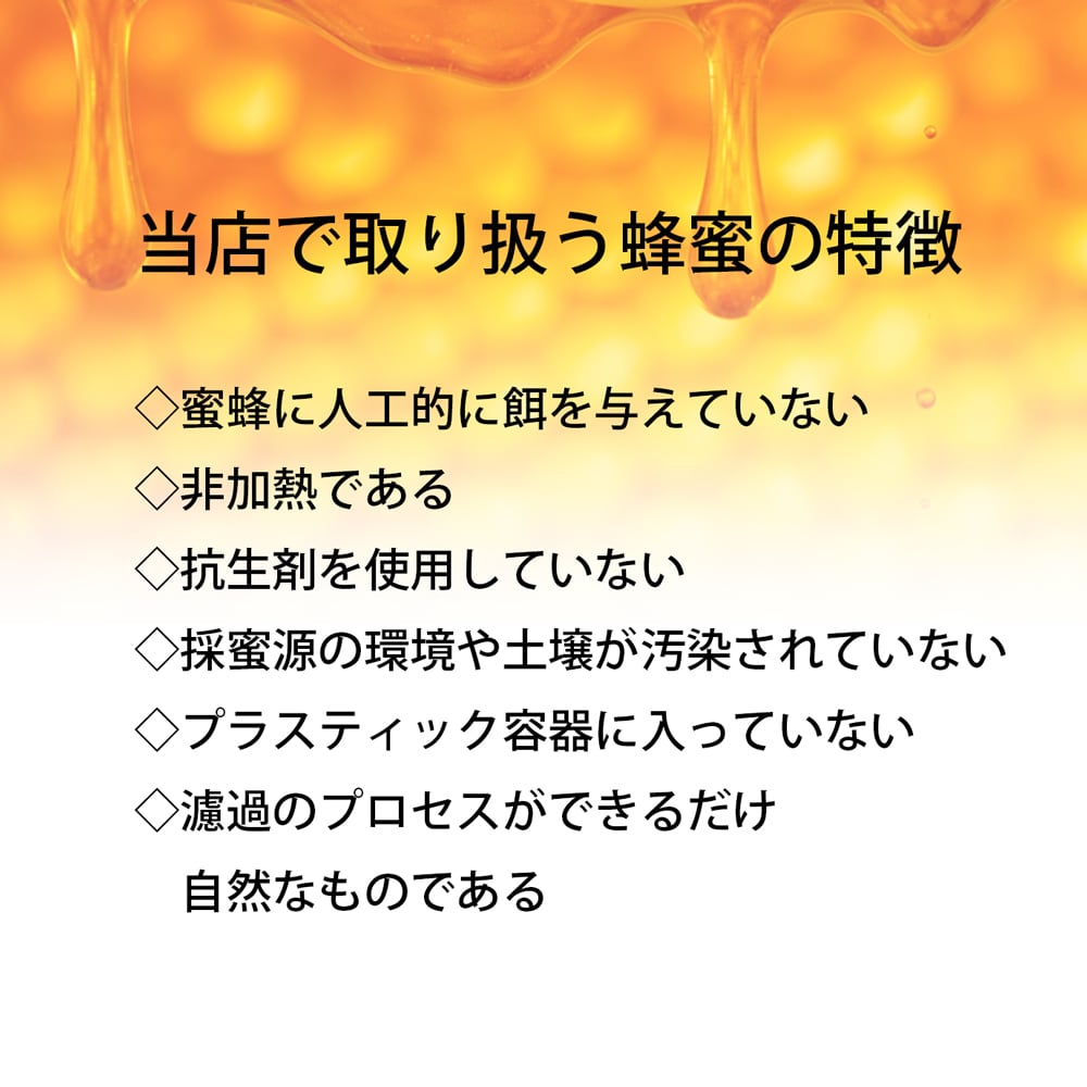 また、はちみつは天然の産物のため、気象条件や採蜜状況などにより同じ植物から採取した場合でも色が違う場合があります。